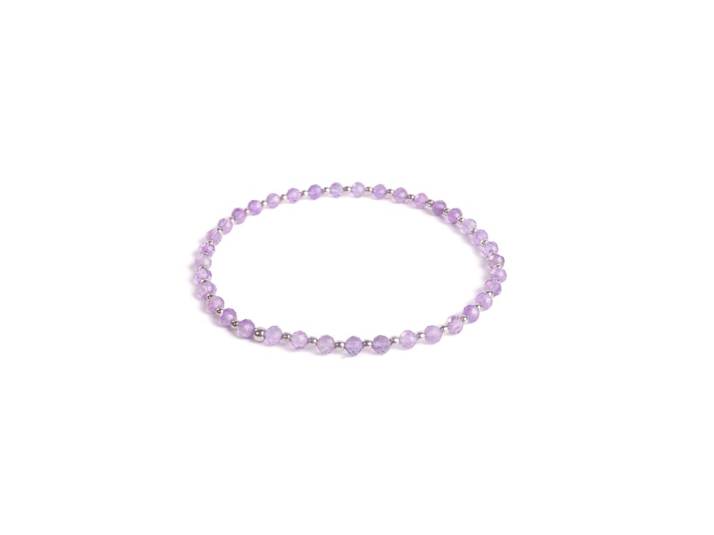 Ručně navléknutý náramek z kamenů vybroušených ametystů s kuličkami z rhodiovaného stříbra vám zpříjemní každý den.