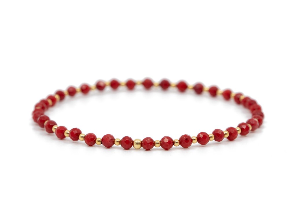Krásný ručně navléknutý korálový náramek s kuličkami ze 14 kt žlutého zlata. Náramek je navléknutý na gumičce a je velmi pohodlný.