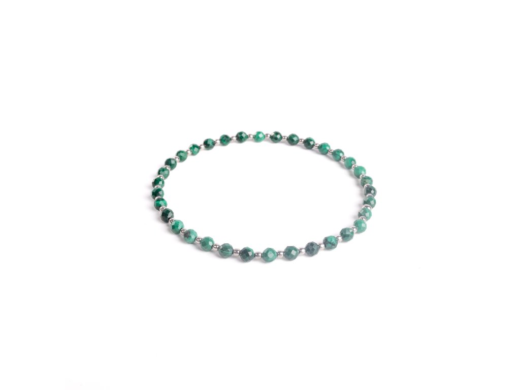Ručně navléknutý náramek z broušených kamenů malachitu s kuličkami z rhodiovaného stříbra vás zaujme svými sytými zelenými pruhy.