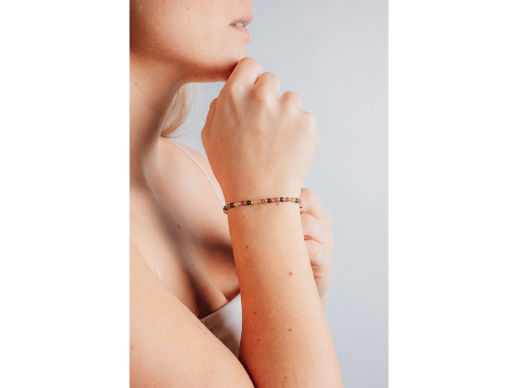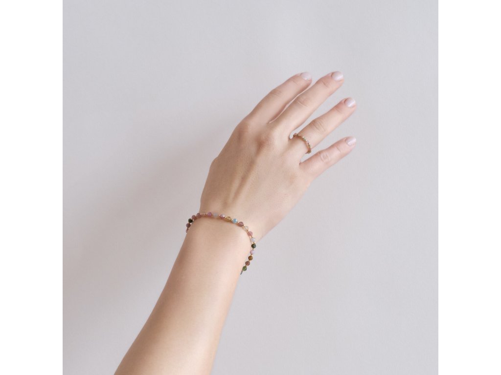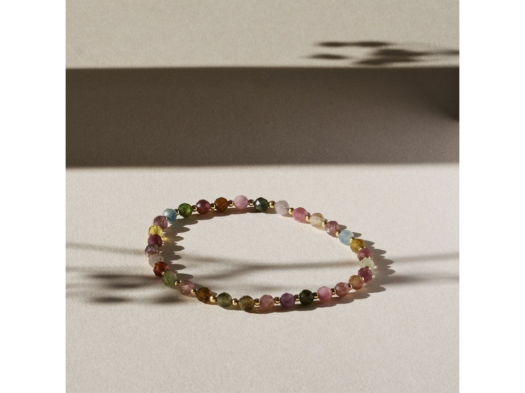 Jemný náramek z přírodního turmalínu doplněný kuličkami ze 14kt zlata. Barevná hra kamenů dodává šperku lehkost a eleganci.