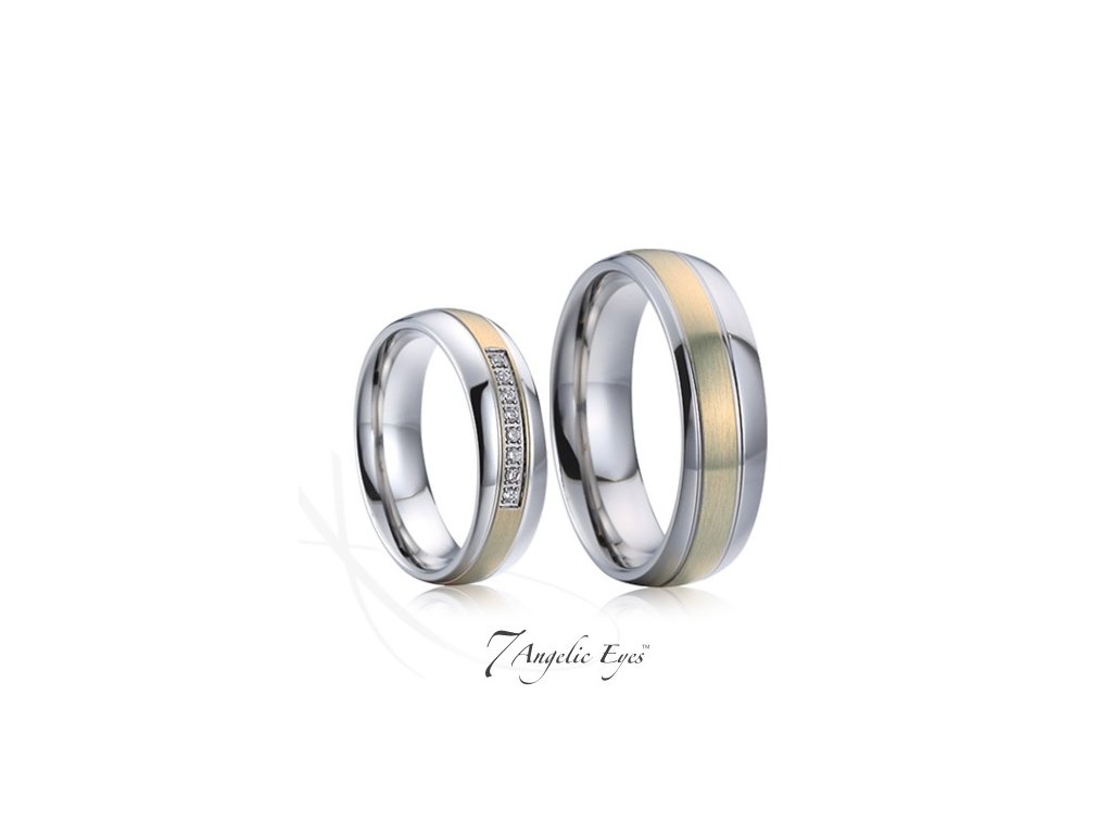 Snubní prsten z chirurgické oceli 316L s šířkou fazony 6,3 mm kombinuje lesklý povrch s jednoduchou linií a matným zlacením po celém obvodu. Tento design vytváří elegantní a moderní vzhled s decentním zlatým akcentem.