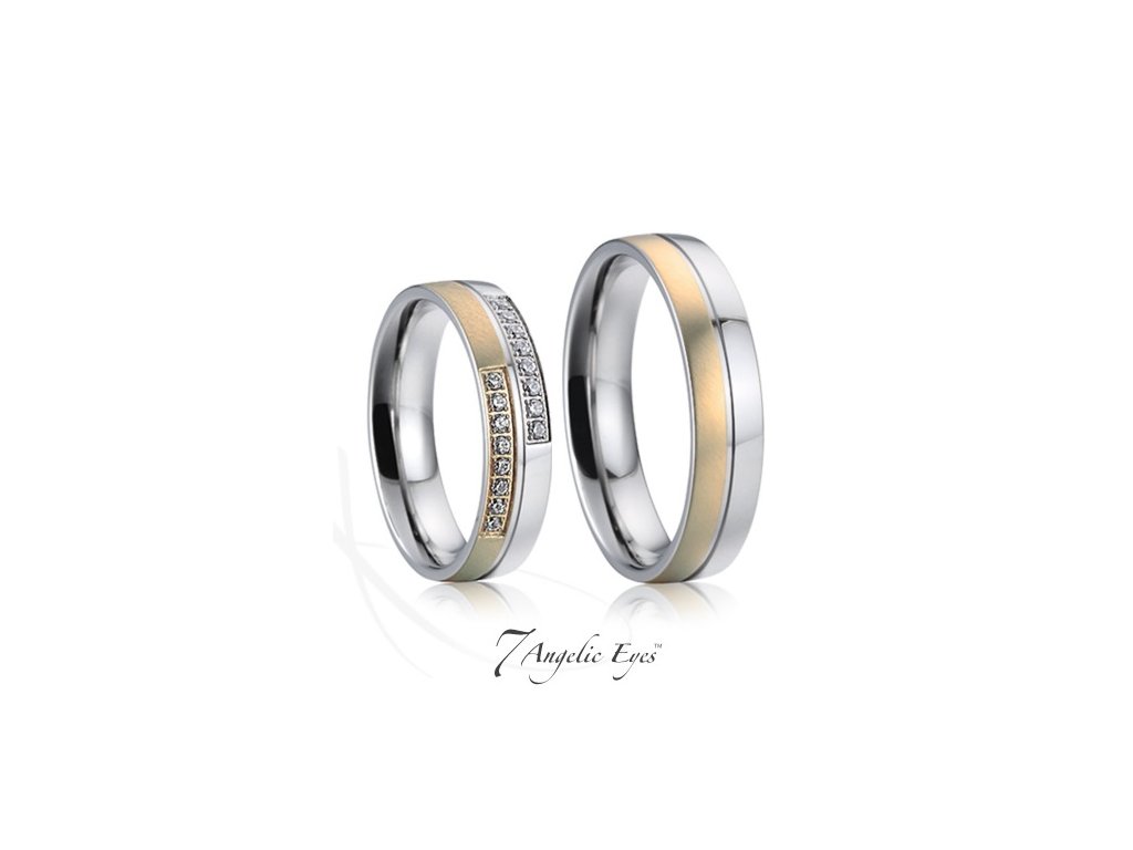 Snubní prsten z chirurgické oceli 316L má šířku fazony 5,0 mm a povrchovou úpravu spojující vysoký lesk se žlutým sametovým zlacením. Tento elegantní kontrast dodává šperku sofistikovaný a moderní vzhled.