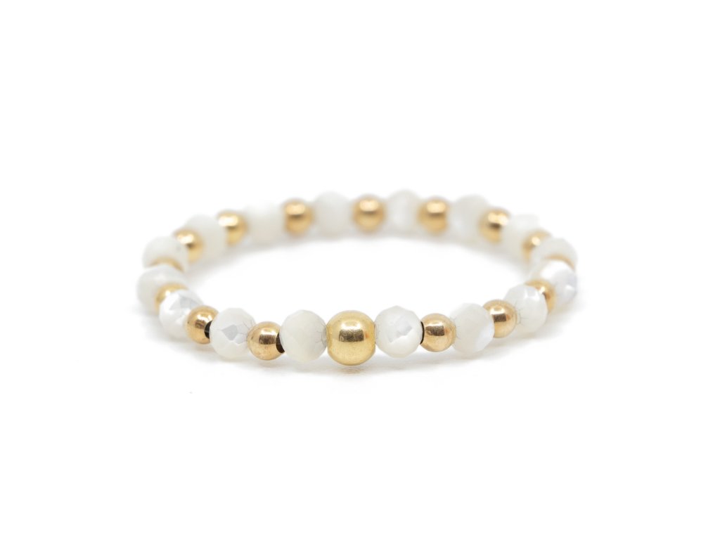 Jednoduchý prsten z broušené perleti se 14kt kuličkami ze žlutého zlata, které krásně podtrhne lesk kamenů.