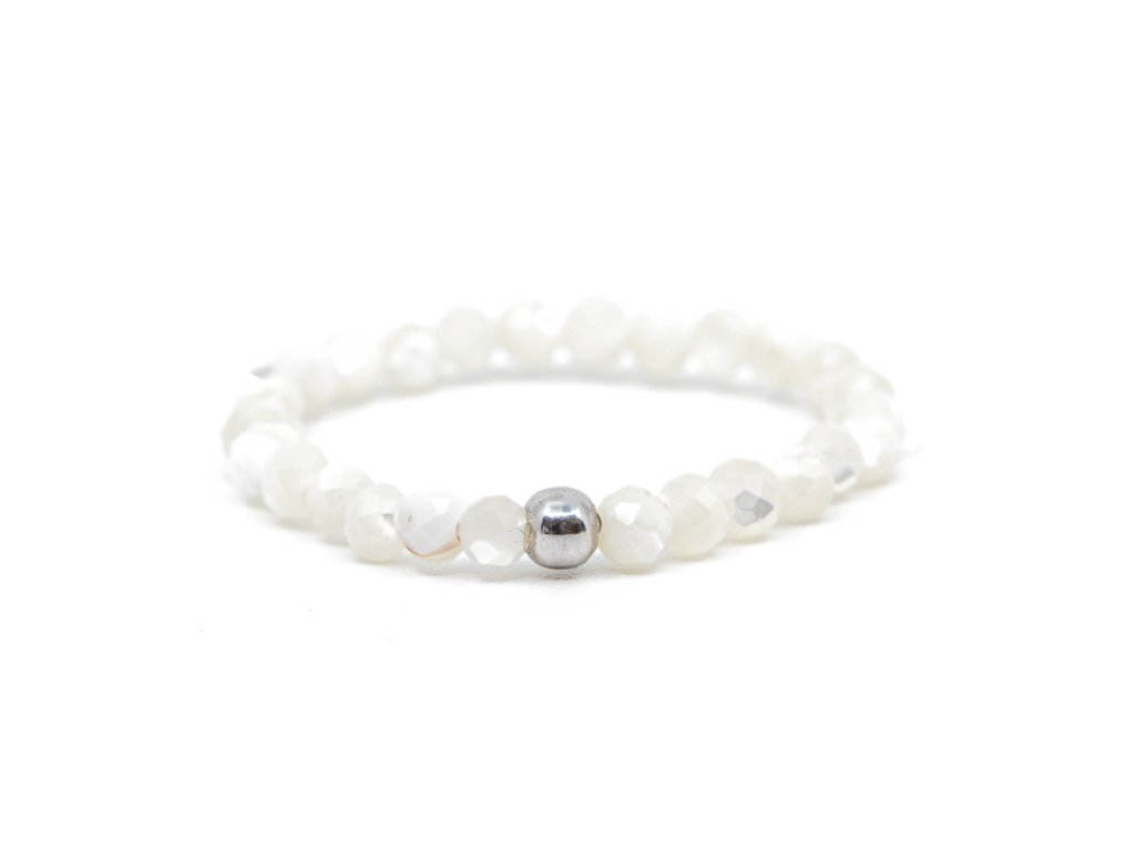 Ručně navlečený náramek z perleti s kuličkou z rhodiovaného stříbra si zamilujete na první dotek.
