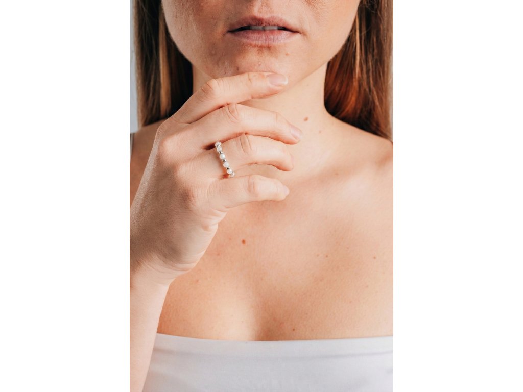 Jemný a elegantní prsten z broušených perleťových korálků se stříbrnou rhodiovanou kuličkou.