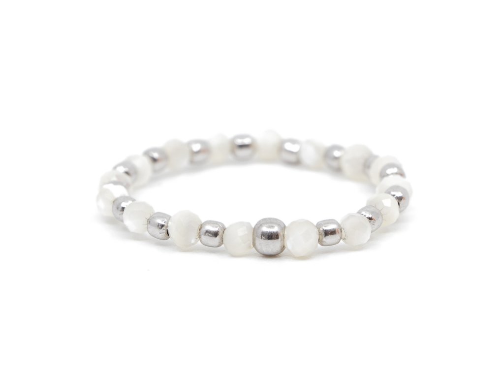Prsten je ručně vyrobený z broušených perleťových kamenů. Nejvyšší možná kvalita AAA těchto kamenů zaručuje perfektní brus a barvu a tudíž i vysoký lesk celého náramku. Prsten je pohodlný při oblékání a perfektně padne na ruku díky kvalitní silikonové gumičce, na které je navlečen. Šperk je naše vlastní tvorba a je skladem, nebo pro Vás bude vyroben. Šperk obdržíte dárkově zabalen s cestovním pytlíčkem, dárkovou krabičkou a certifikátem původu drahého kamene.