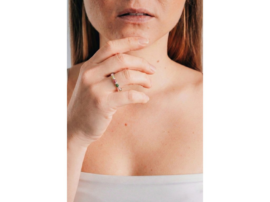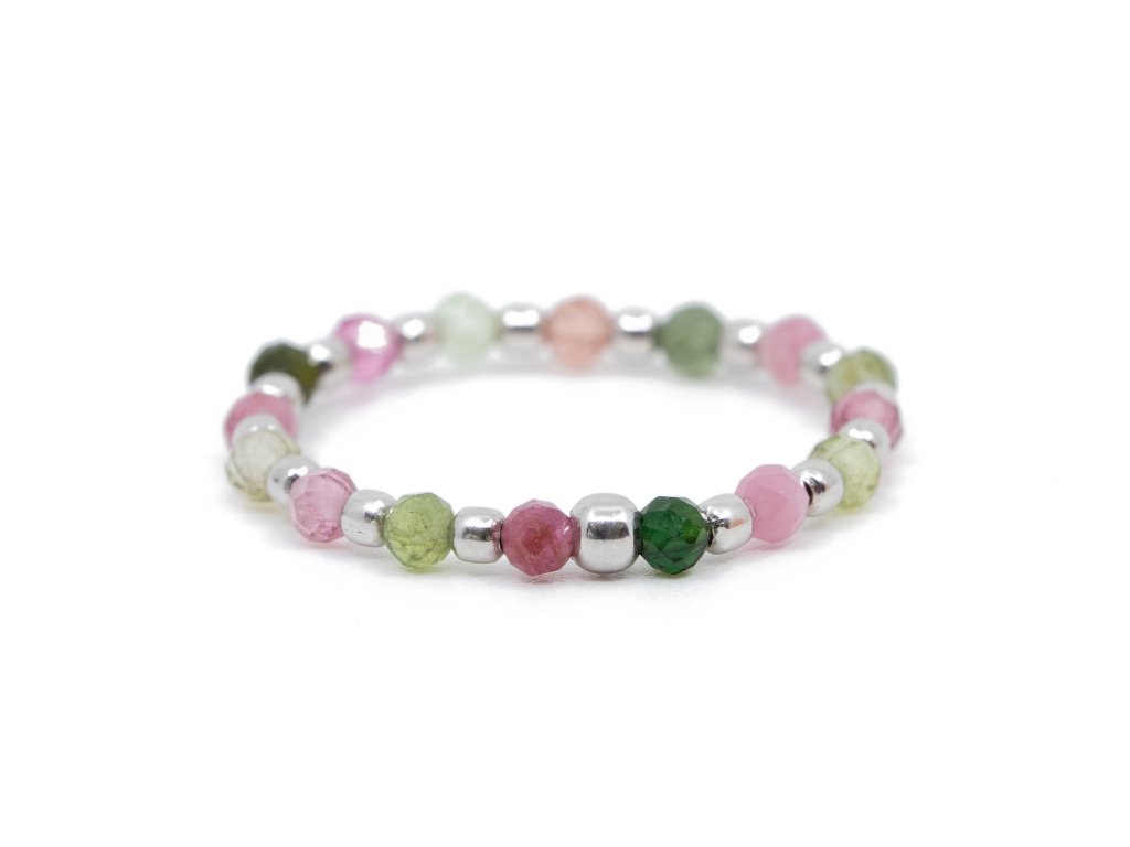 Veselý a přesto něžný prsten z barevných turmalínů, doplněný o kuličky z rhodiovaného stříbra.