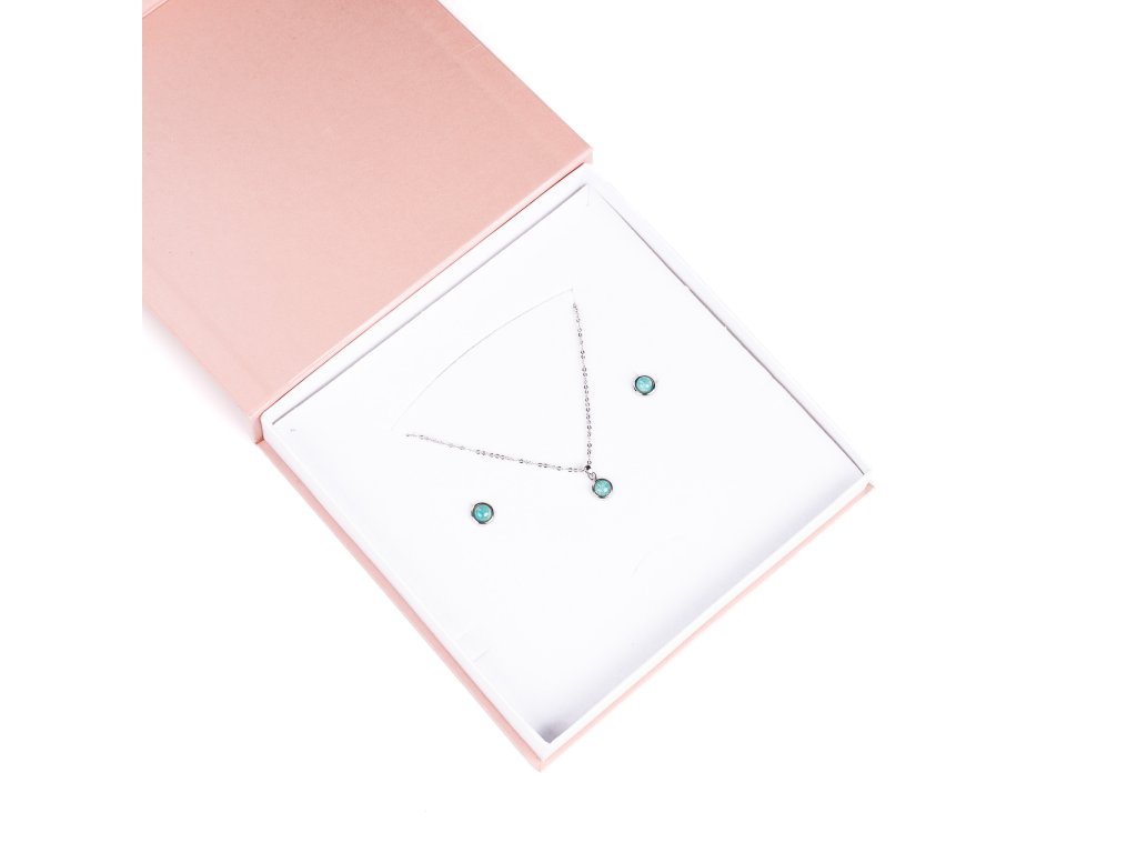 Krásná stříbrná souprava náušnic na puzetové zapínání a přívěsku je osázena amazonitem z Brazílie ve velikosti 6 mm. Kameny mají nejvyšší možnou kvalitu. Přívěsek je dodáván bez řetízku. Soupravu obdržíte zabalenou v dárkové krabičce a s certifikátem o původu drahých kamenů.