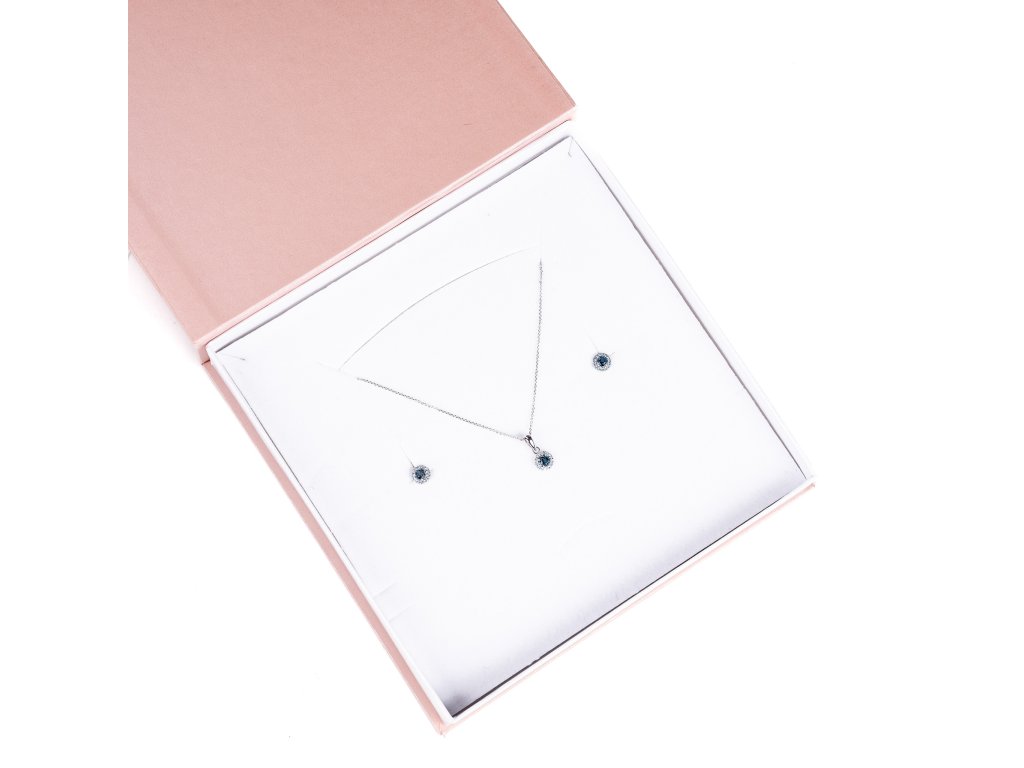Krásná jemná souprava náušnic na puzetové zapínání a náhrdelníku s prodlužovacím řetízkem. Šperky jsou osázeny modrým topazem London ze Srí Lanky a švýcarským modrým topazem z Brazílie ve velikosti 3,5 mm. Kameny mají nejvyšší možnou kvalitu AAA. Soupravu obdržíte zabalenou v dárkové krabičce a s certifikátem o původu drahých kamenů.