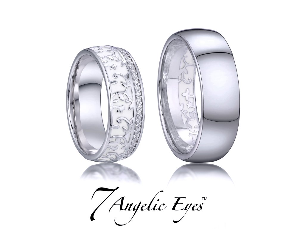 Snubní prsten ze stříbra 925/1000 o šířce fazony 7,0 mm váží podle velikosti 6,8–8,0 g a má povrchovou úpravu kombinující bílý smalt s jemným vzorem ve vysokém lesku. Elegantní design vzoru je umístěn uvnitř prstenu a ladí s dámským protějškem.