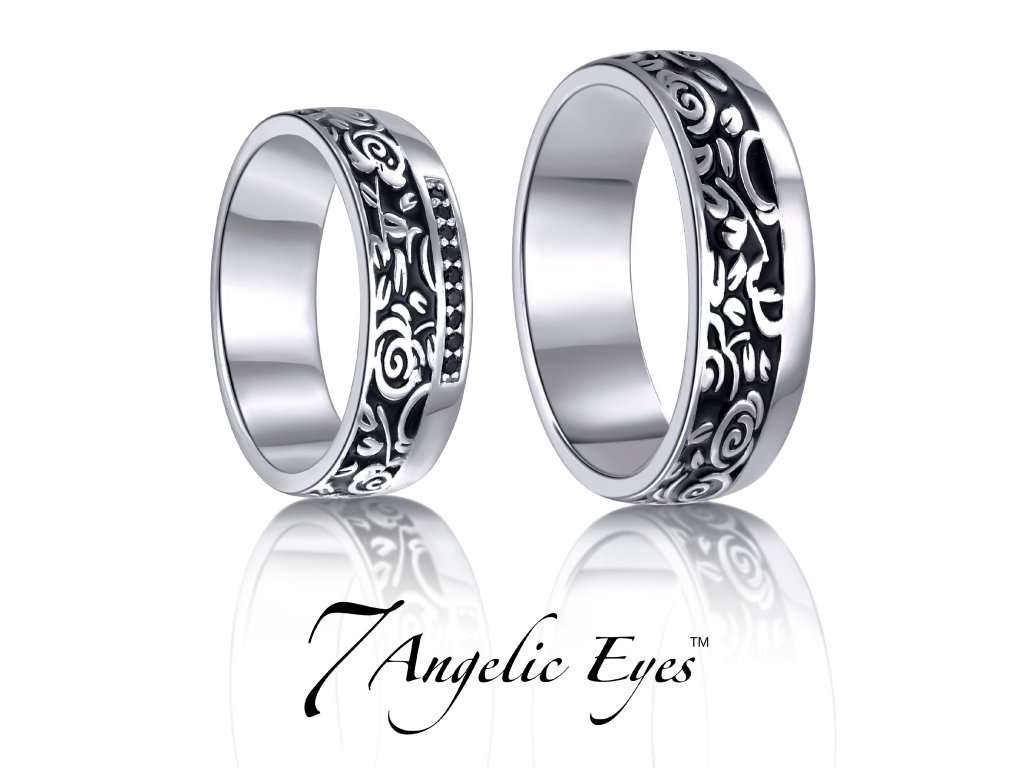 Snubní prsten ze stříbra 925/1000 má povrchovou úpravu kombinující vysoký lesk s černým smaltem a elegantním květinovým vzorem. Šířka fazony je 6,2 mm a váha prstenu se liší podle velikosti od 6,0 do 6,9 g.