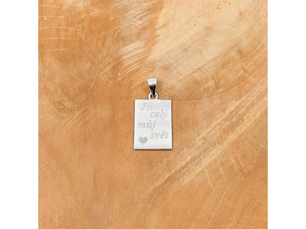Přívěsek ve tvaru obdélníku je vyroben ze stříbra v ryzosti 925/1000 a je ve velikosti 18 x 12 mm. Přívěs se krásně leskne a je vysoce kvalitní. Šperk rádi opatříme rytinou dle vašeho přání, ať už obrázkem nebo nápisem. Přívěs s rytinou je dělaný na přání zákazníka, jedná se tedy o zakázkovou výrobu. Vyryté šperky nelze vrátit, ani vyměnit a je nutná platba předem.