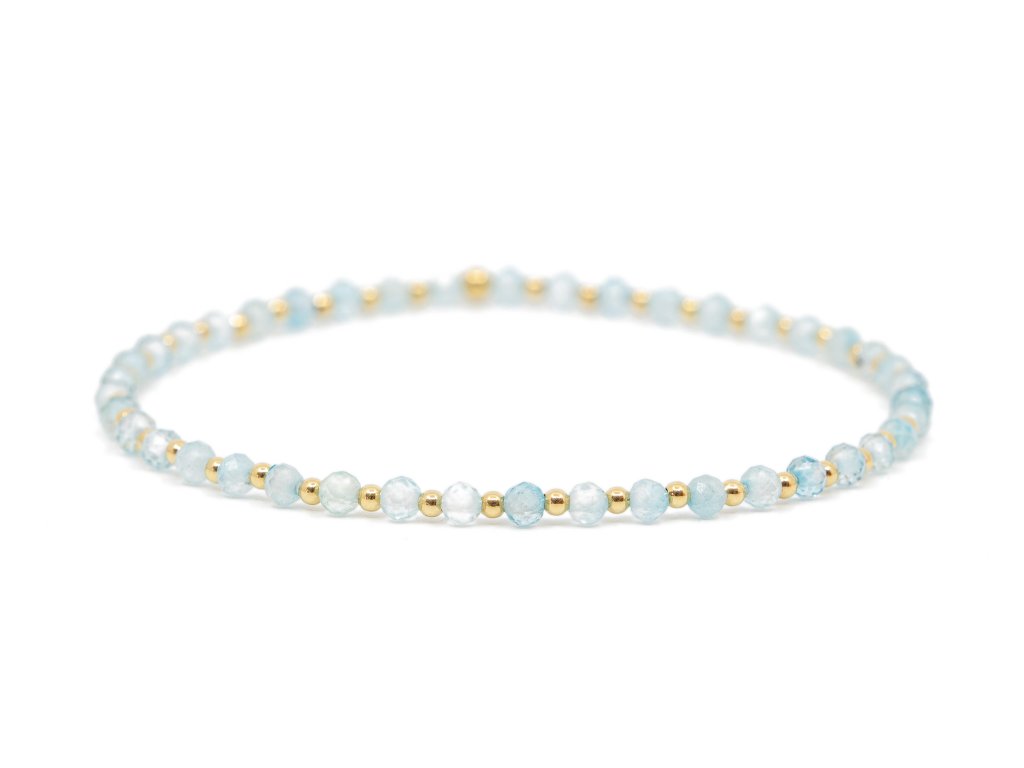 Ručně navléknutý náramek z topazu s kuličkami ze 14 kt žlutého zlata. Náramek je velmi pohodlný a jistě si jej zamilujete.