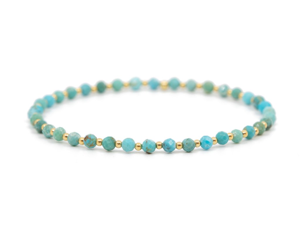 Krásný ručně navléknutý tyrkysový náramek s kuličkami ze 14 kt žlutého zlata. Náramek je navléknutý na gumičce a je velmi pohodlný.