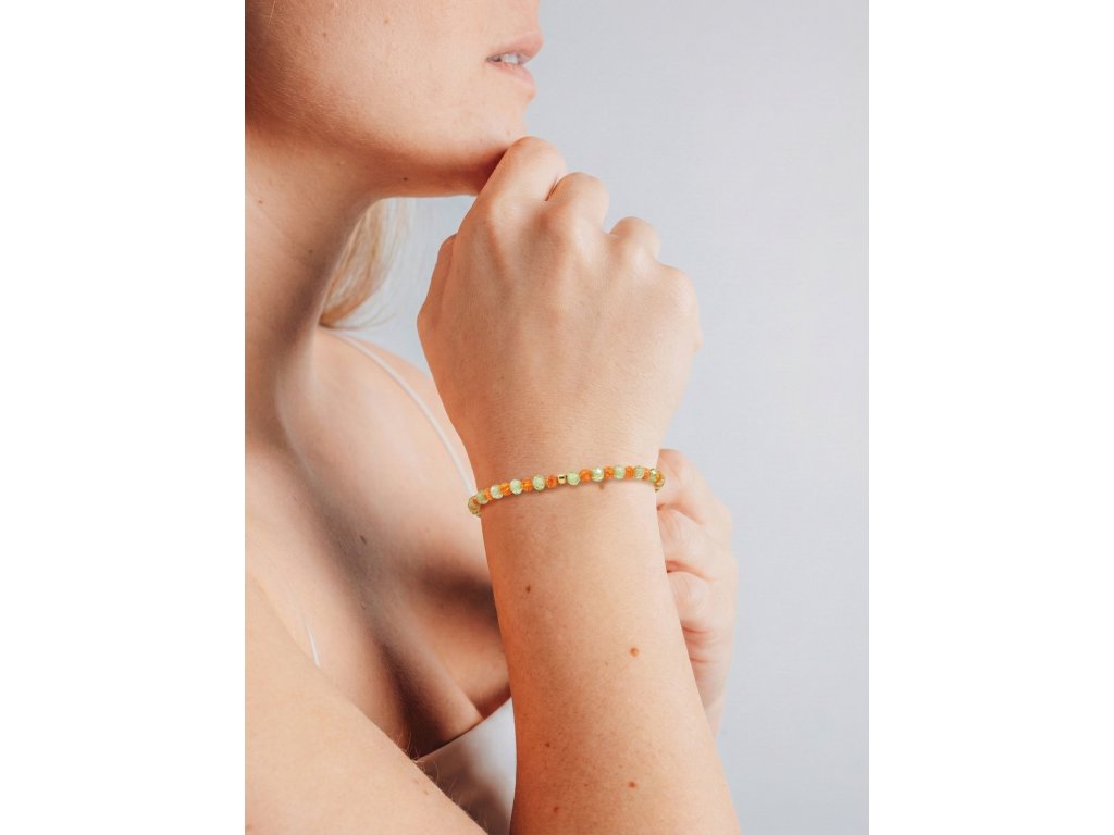 Nepřehlédnutelný náramek z oranžových bello opálů a olivínu, který je doplněný kuličkou z 14kt žlutého zlata.